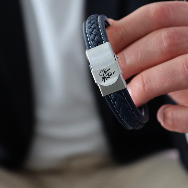 Bij deze set is de Musthave Donkerblauw leren armband gecombineerd met de sediment natuursteen armband in het sky blue!